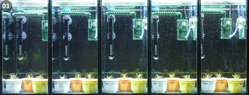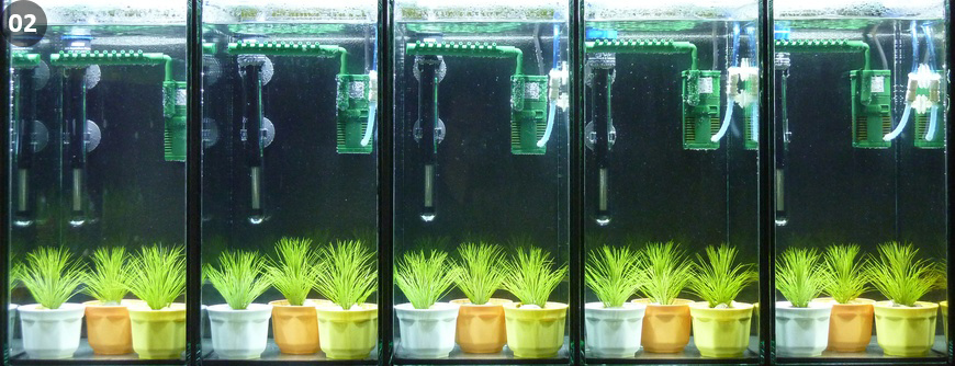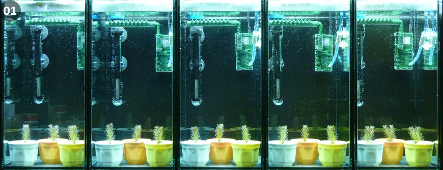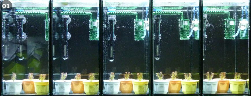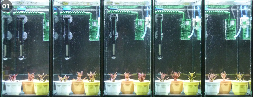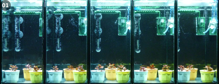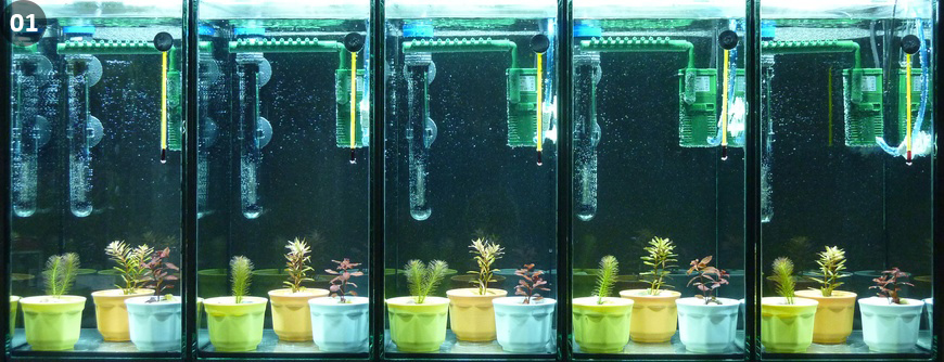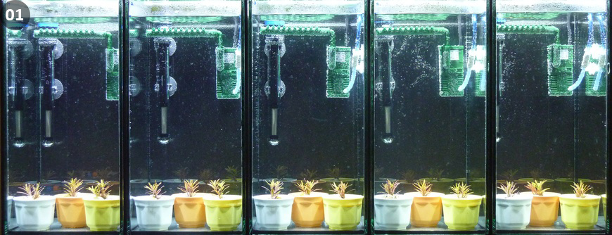 Thử nghiệm trên dàn hồ gồm 5 hồ kích thước 20cm x 20cm x 40cm (dài rộng cao), dung tích 16 lít. Mỗi hồ đều có 1 lọc treo KHÔNG có vật liệu lọc bên trong, mục đích là để hạn chế tối đa khả năng vật liệu lọc ảnh hưởng đến nồng độ dinh dưỡng đưa vào, lọc treo này có nhiệm vụ luân chuyển nước, tạo dòng, luân chuyển co2… Mỗi hồ đều có nhiệt kế theo dõi. Trong mỗi hồ đều có 3 chậu nhựa nhỏ để trồng cây, được đổ đầy bằng nền cát trơ có đường kính 0.7 đến 1.2mm. Mục đích dùng nền trơ để tính toán chính xác lượng dinh dưỡng cung cấp, khi dùng nền có dinh dưỡng thì việc tính toán là không thể.